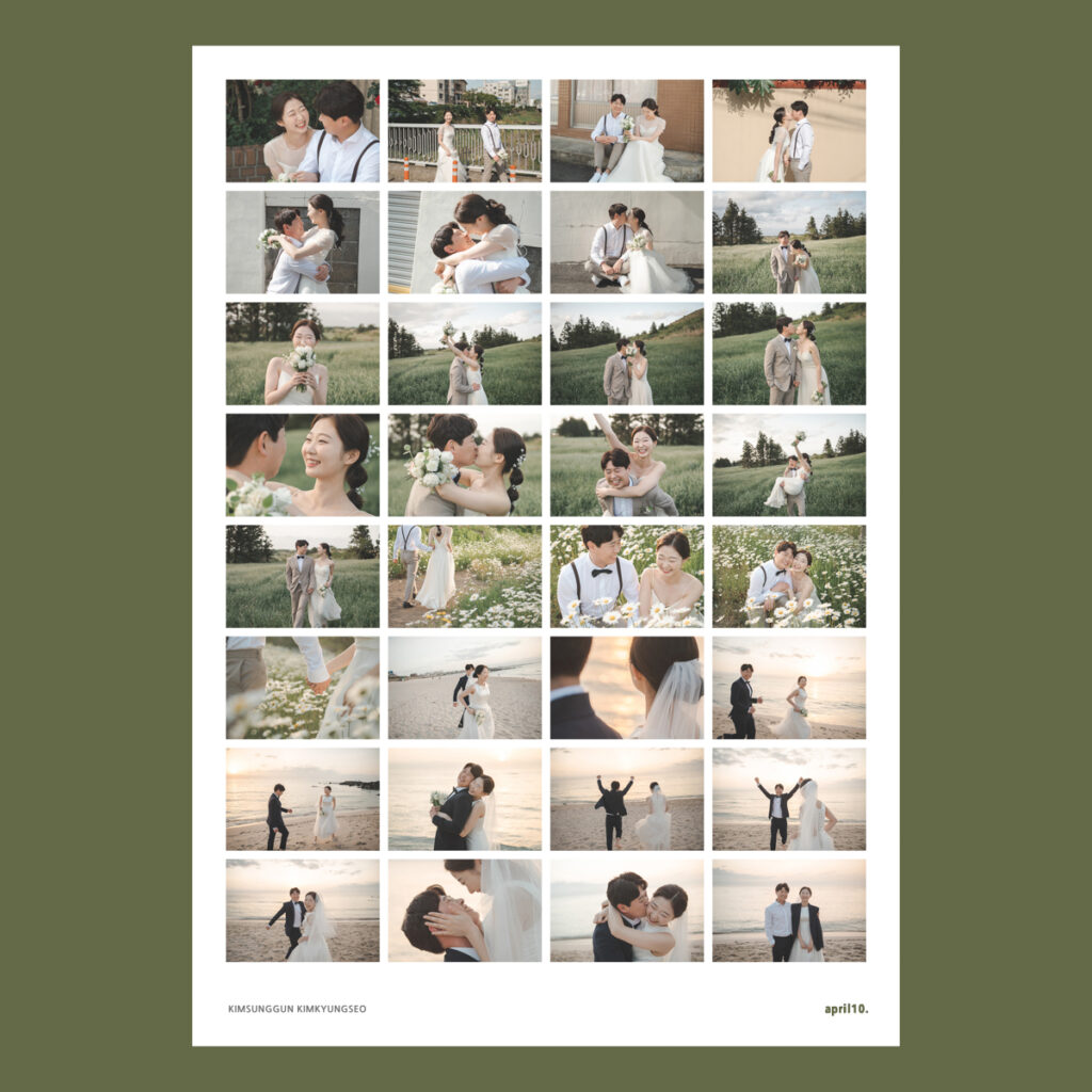 ‘웨딩 보다는 사랑’ 약 2시간 30분 장소 2곳 의상 최대 2벌 색감보정 200여장 세부보정본 20장 * 헬퍼 및 웨딩샵 이용불가 * 500,000 + Special Option * 캠코더영상 1개 (2~3분) + 300,000 * 폴라로이드 10장 (Wide Size) + 50,000 일상적이고 소소한 사랑을 촬영합니다. 완벽하지 않아도 좋아요. 첫 데이트처럼 서로에게 잘 보이기 위해 꾸민다는 마음으로 준비해주세요. 내가 좋아하는 옷을 고르고 직접 자신있는 헤어스타일을 하면 그걸로 충분합니다. 어렵거나 부족한 부분이 있어도, 서로 채우고 맞춰가며 촬영하다보면 온전히 두 사람으로 가득한 사진이 될 거예요. * 촬영에 관한 모든 것은 상담을 통해서 함께 결정합니다. @b.season_ |